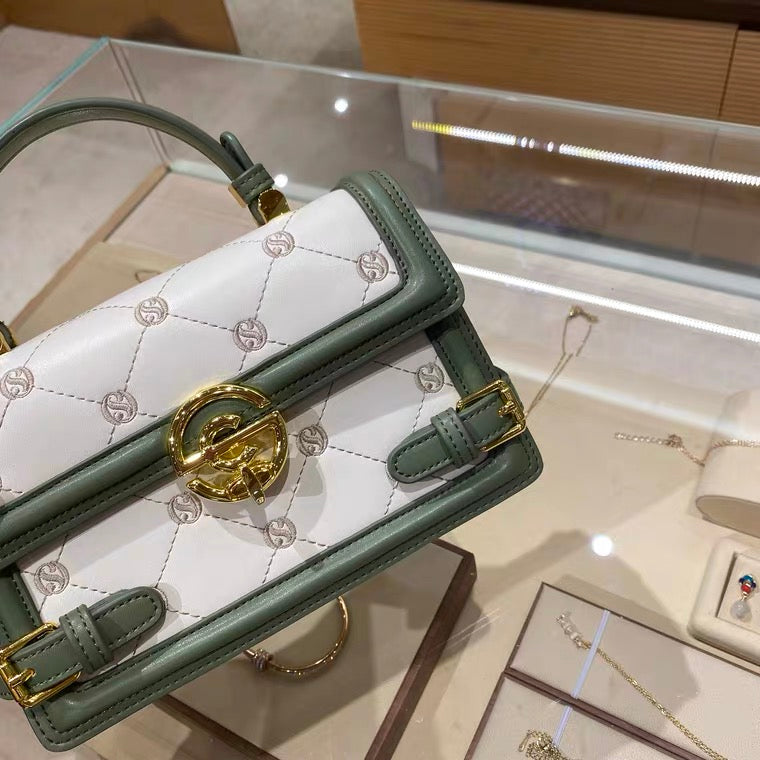 White with Green Trim, rhomboid pattern, portable cross-body. Available for pick up or free delivery in Regina.